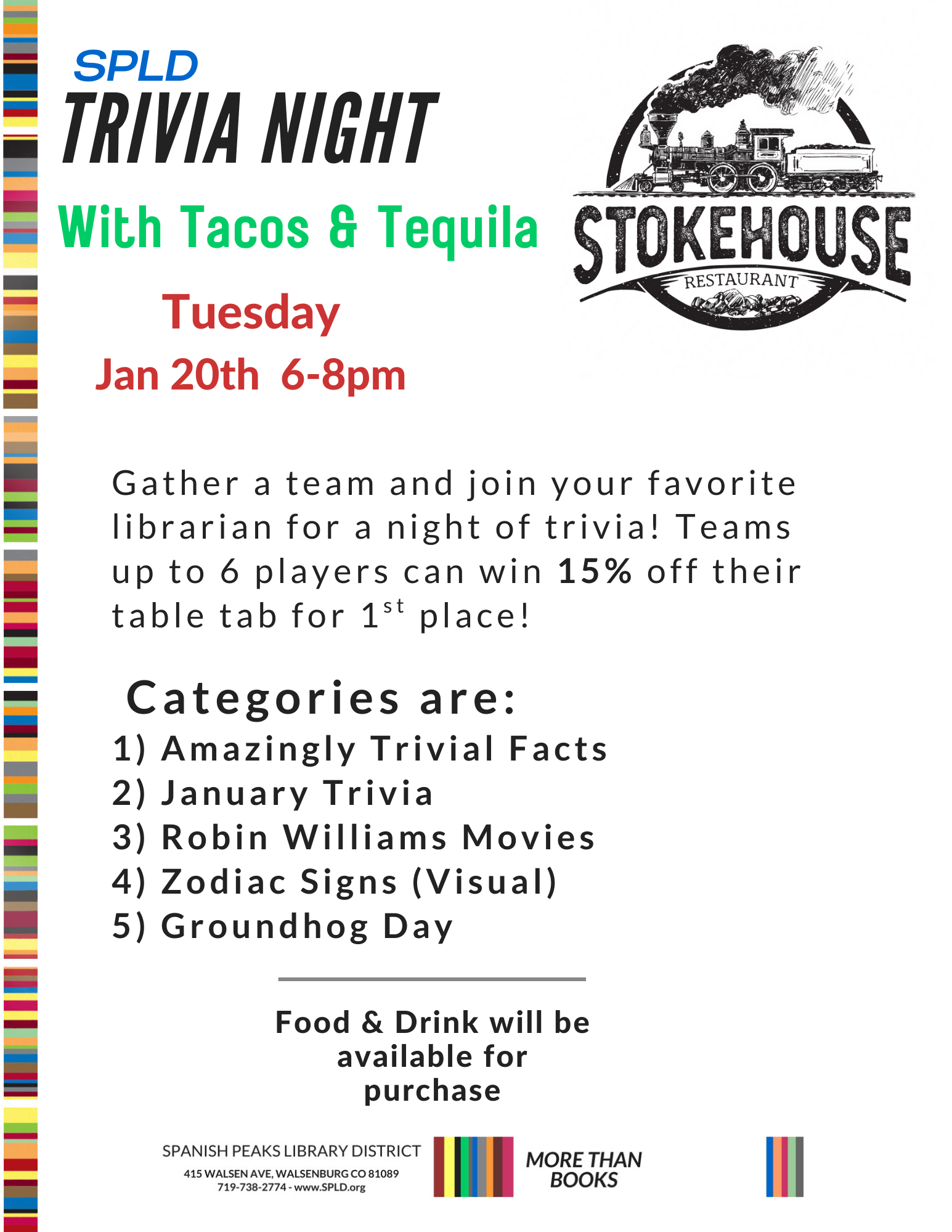 Join your Favorite Librarian for Trivia, Tacos, & Tequila every 3RD Tuesday at THE STOKEHOUSE Restaurant from 6-8 PM! Gather a team of up to 6 members to win 15% off your table for 1st place!