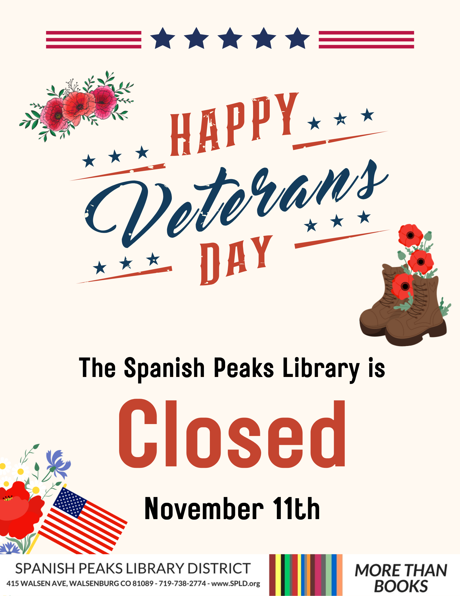 The Spanish Peaks Library will be closed Tuesday, November 11th for Veterans Day to honor those that have served. For any library needs please visit our cloud library app for […]