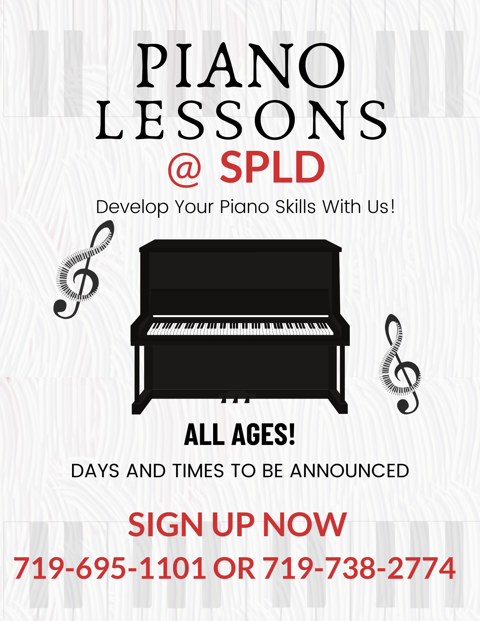 Enjoy Piano Lessons at the SPLD every Tuesday from 10-11 AM! Lessons are available for All Ages! Develop your piano skills with us! SIGN UP NOW: 719-695-1101 or 719-738-2774
