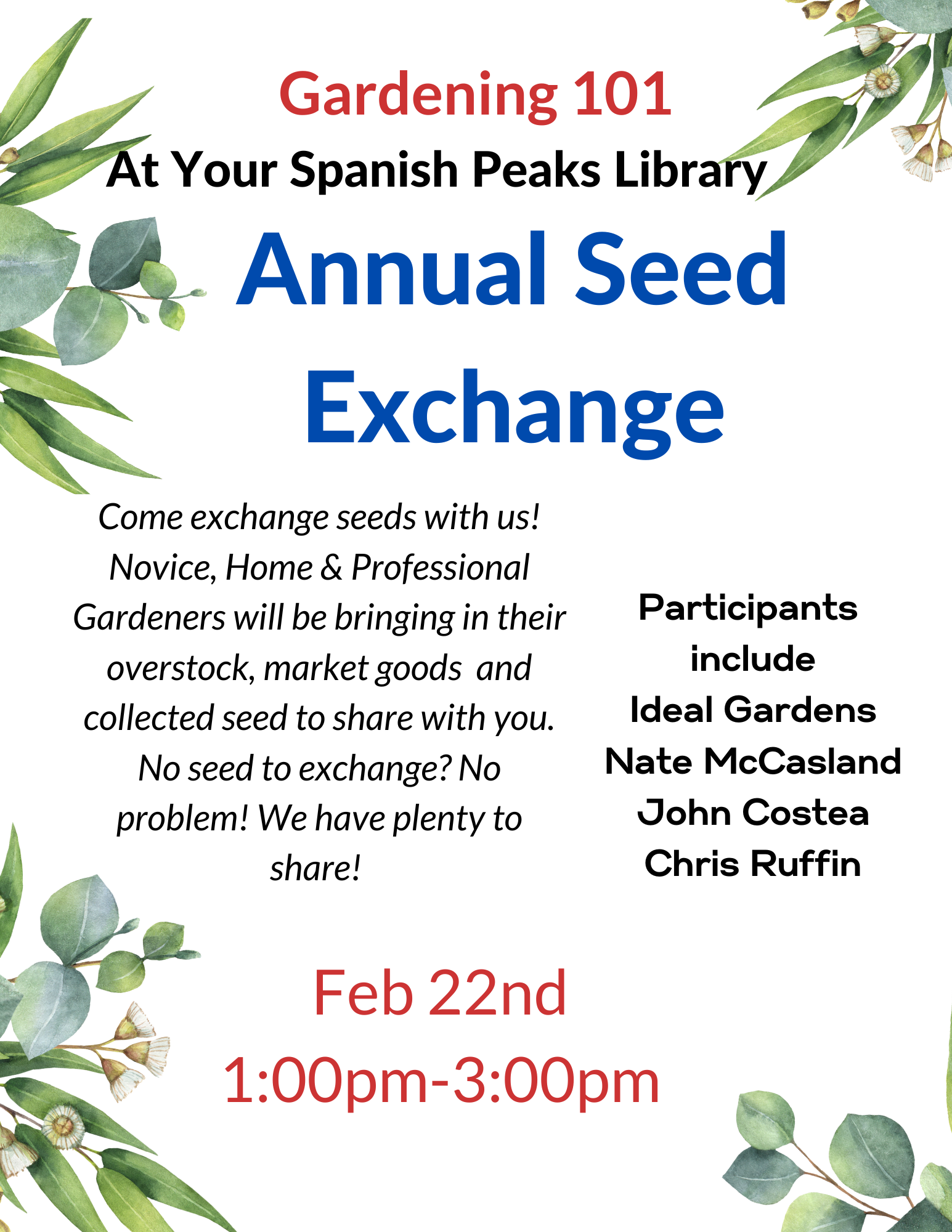 The Gardening 101 Annual February Seed Exchange will be held Today, February 22nd, in SPLD Community Room. Come exchange seeds with us! Novice, Home & Professional Gardeners will be bringing […]