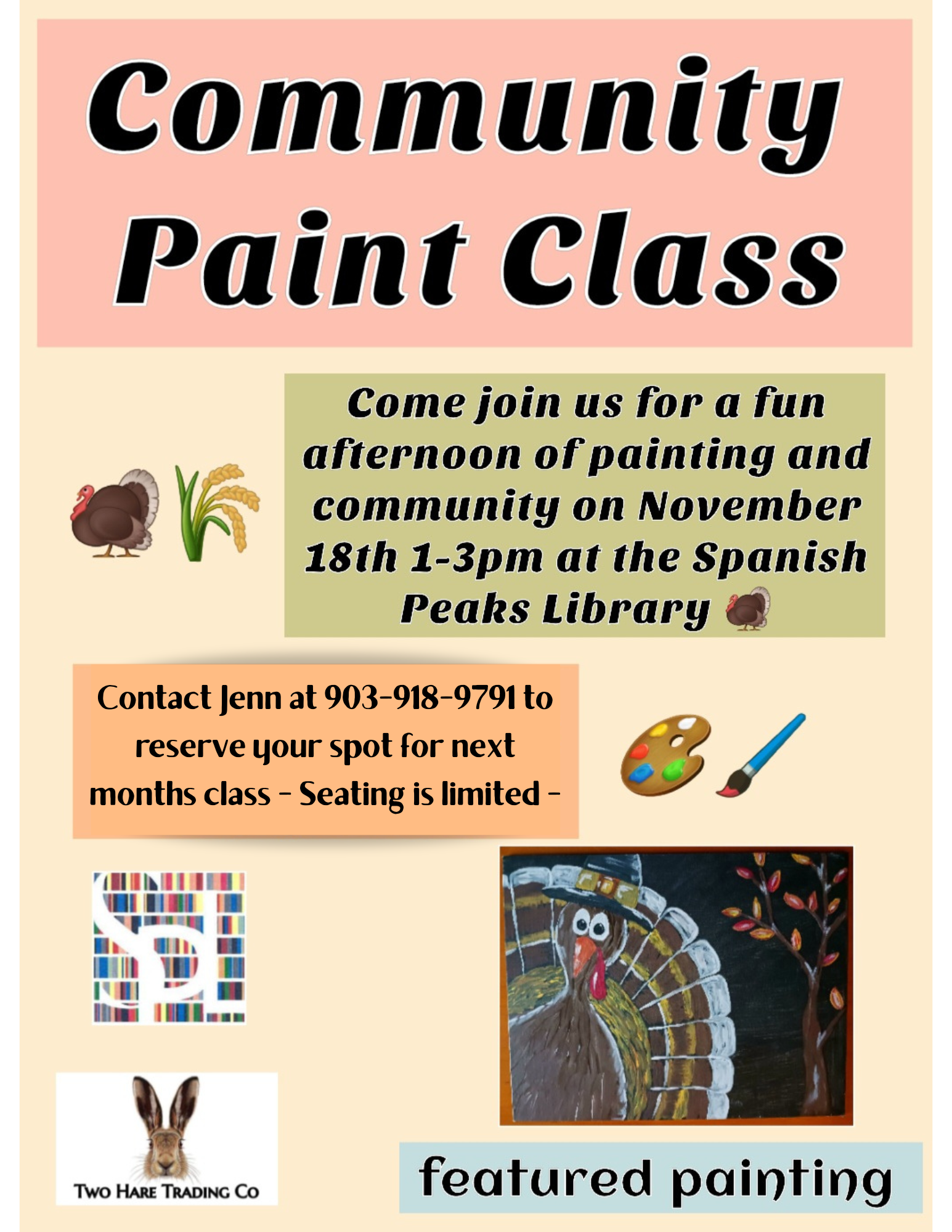 Join art instructor Jenn Dunn for a monthly Community Paint Class for adults at the SPLD.  The First class will take place Tuesday, November 18th from 1-3 PM in the SPLD Community Room.  This class will only be available to those that reserved a seat by Friday, November 14th at 903-918-9791, as seating is limited.